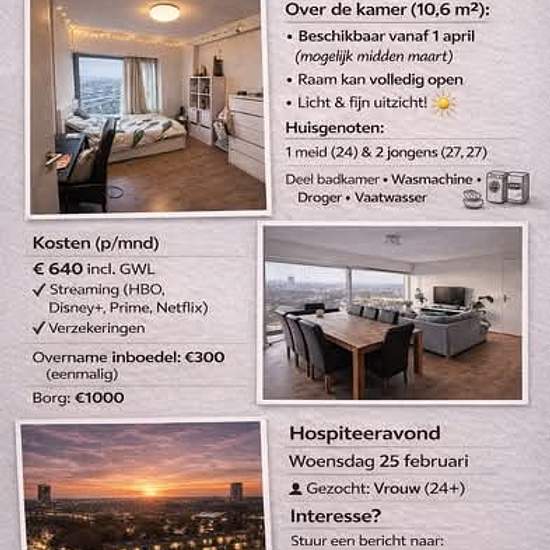 Hi kamerzoekende, In ons nederige stulpje in Amsterdam Nieuw-West (Osdorp) komt een kamer vrij! Daarom zijn wij opzoek naar een vrouw (24+) die in eind studie zit, of beginnend werkend is. Je komt te wonen met 1 meid (24) en twee jongens (27 en 27). De kamer is 10.6 m2. Omdat deze kamer oorspronkelijk gemaakt is als kantoor, kan het raam volledig open (er zit wel een doorzichtig hekje voor uiteraard :)). Je deelt de badkamer met één andere huisgenoot. We hebben een wasmachine, droger en vaatwasser en hebben ons best gedaan om er een gez...