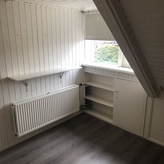 Hele zolderverdieping met vrije opgang, op loopafstand van het station. De woonruimte bestaat uit twee lichte kamers van elk tien vierkante m. Een met dakkapel, de andere met Velux-dakraam. Er is een ruime overloop en een extra kamer/inloopkast. Keuken en ruime badkamer met bad worden gedeeld. Geschikt voor een stagiaire of werkende die woonruimte zoekt op een centrale, praktische plek in het centrum van Steenwijk.