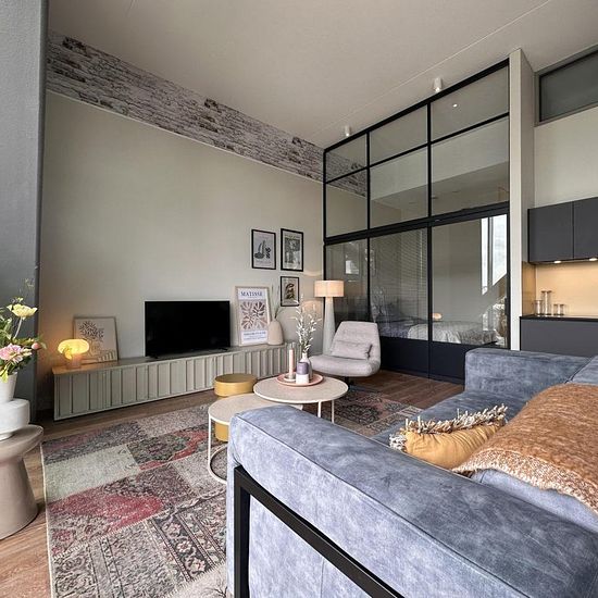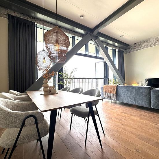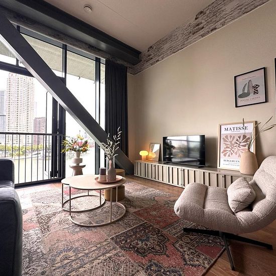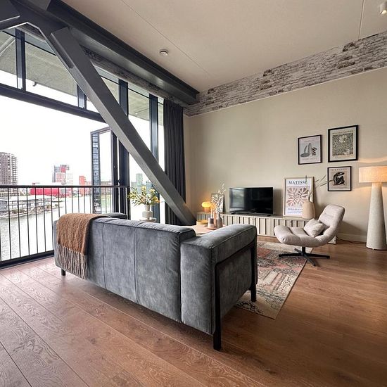 Stunning furnished 2-room (with guest area) Fenix apartment of approximately 83m² with magnificent city views and a south-facing terrace/garden at the front.Katendrecht, also known as "The Cape," is a popular peninsula located between the Maashaven and Rijnhaven harbors in Rotterdam. It's teeming with charming restaurants, shops, and (coffee) bars, offering a wide range of culinary delights. This makes Katendrecht a true dream destination for food lovers! Deliplein is a charming spot with many options for a good cup of coffee, dinner, or a n...