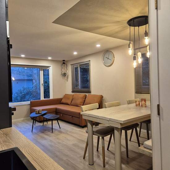 Heerlijk rustig gelegen chalet op chaletpark Kempenbos. Op zoek naar een tijdelijke woonruimte om heerlijk tot rust te komen? Dit gerenoveerde chalet ligt op een rustig kavel in Chaletpark Kempenbos. Chaletpark Kempenbos is gevestigd in het mooiste deel van Brabant: Het Land van de Hilver. Direct grenzend aan een uitgestrekt natuurgebied met heide, bossen en vennen. En vlakbij de dorpjes Hilvarenbeek, Oirschot, Eersel en Oisterwijk. Indeling: Fijne lichte woonkamer voorzien van een zithoek, eethoek en openslaande deuren naar de overkapping....