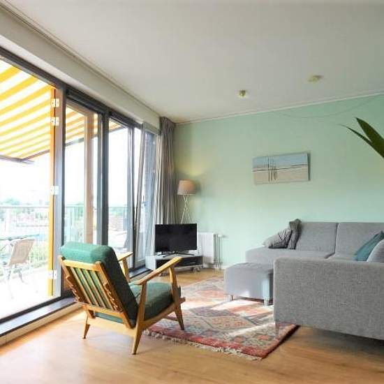 Spacious penthouse, overlooking the center of Utrecht, with a lovely, west facing balcony and the possibility to rent 2 parking spaces in the parking garage under the complex, offered for rent. The center of Utrecht is a few minutes walking distance from this property.Ground floor:Via the main entrance with intercom and mailboxes the hallway can be accessed, which provides acces to the stairs or elevator. The penthouse is located on the 4th floor, and can be reached both via the elevator and the staircase.4th floor:At the end of the gallery ...