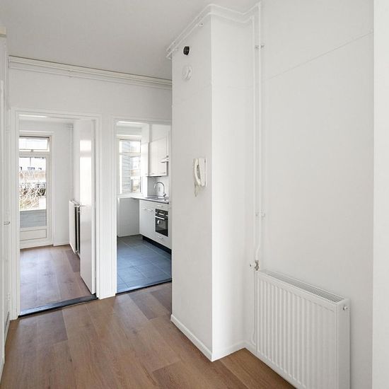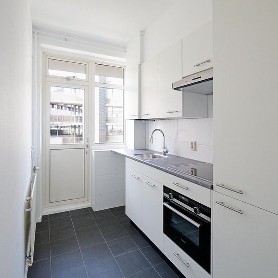 PLEASE NOTE: Telephone enquiries will NOT be accepted. Please send your introduction via Funda or email. Fantastic 3/4-room apartment on the first floor with private storage. Ideally located near main roads, public transport, and various shops within walking distance. Layout: Secure entrance with staircase leading to the first floor. Entry into the hallway with a separate toilet and washbasin. Spacious and bright living room with large windows providing plenty of natural light. Separate kitchen equipped with built-in appliances and access to...