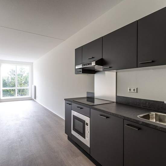 Step into your own palace and immediately behold a beautifully built-in kitchen with all the luxury you could wish for. Feel like a true kitchen prince as you prepare a tasty meal on the induction hob. The smell of cooking is drawn away by the extractor hood so your studio always smells fresh. The ventilation helps with this and always brings you a healthy dose of fresh air. Not in the mood to cook? Use the combination microwave while you enjoy the sunlight streaming through the large windows in the living room. You’ll experience so much spa...
