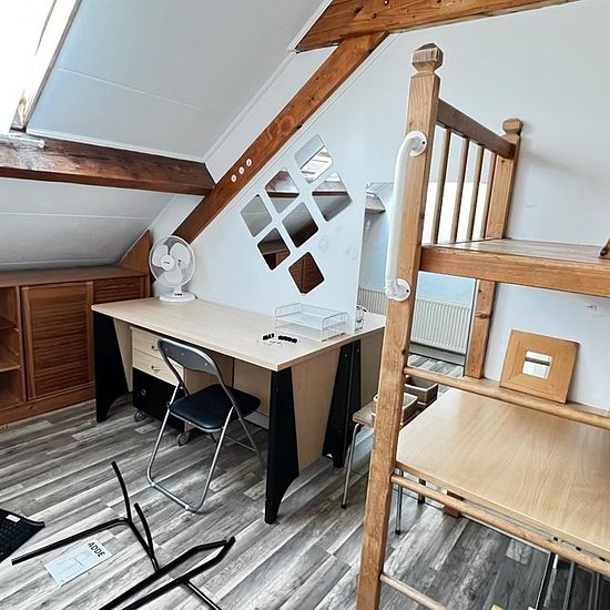 Small, cozy student room with an elevated sleeping area (mezzanine/patio), located in a lively area with shops, public transport, and sports facilities. Kitchen shared with one roommate.