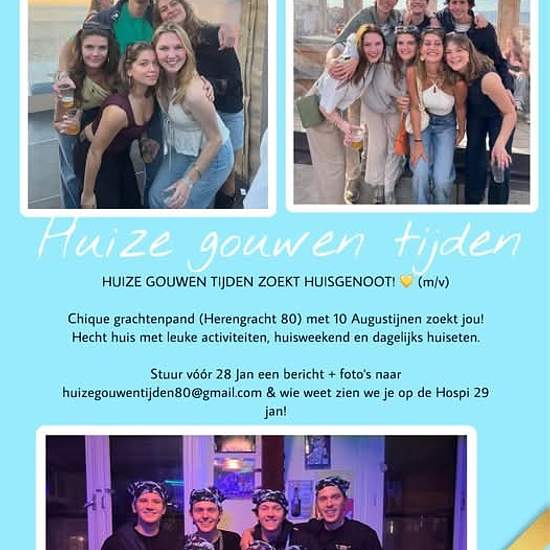 HUIZE GOUWEN TIJDEN ZOEKT HUISGENOOT!! (M/V) In een chique en statig grachtenpand (Herengracht 80) wonen wij met 1 kat (Kutje V) en 10 (Augustijnse) huisgenoten (m/v) aan een van de mooiste en oudste Leidsche grachten. Wij onderscheiden ons door onze hechtheid en mooie huisavonden. Elk jaar gaan we op huisweekend, organiseren we veel activiteiten en we hebben dagelijks huiseten. Natuurlijk met altijd een koud biertje! Wat heeft HGT te bieden? - Elektriciteit en stromend water, 4 wc’s en 3 douches - Internet, wasmachine en droger - Schoonm...