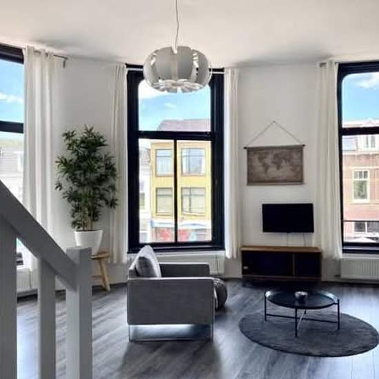Apartment for rent on Kruisstraat in Utrecht Rent: € 1,482,- Area: 76 m2 Layout: Entrance via the stairs. Stairs to the 1st floor. Apartment entrance. Wardrobe, video intercom. Separate toilet with sink. Beautiful living room with high ceiling and many windows with a view of Biltstraat. The open kitchen is equipped with a refrigerator with freezer, dishwasher, oven, ceramic hob and extractor hood. Seating area with sofa and armchairs. Dining area with dining table. Via the internal stairs to the 2nd floor. On this floor is the sleeping are...
