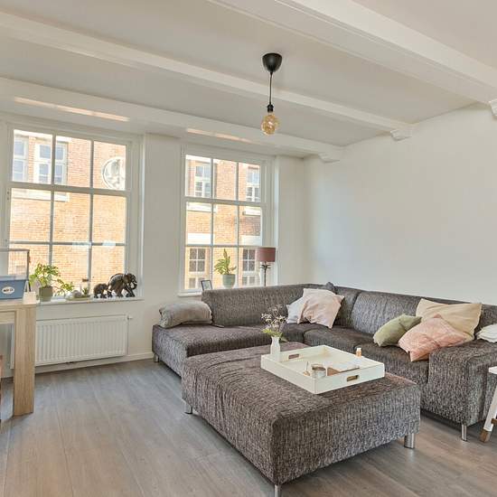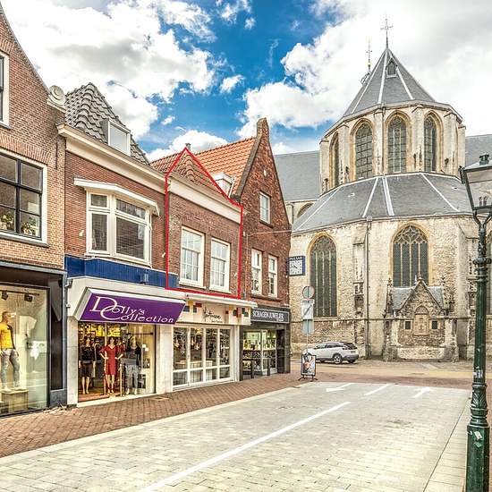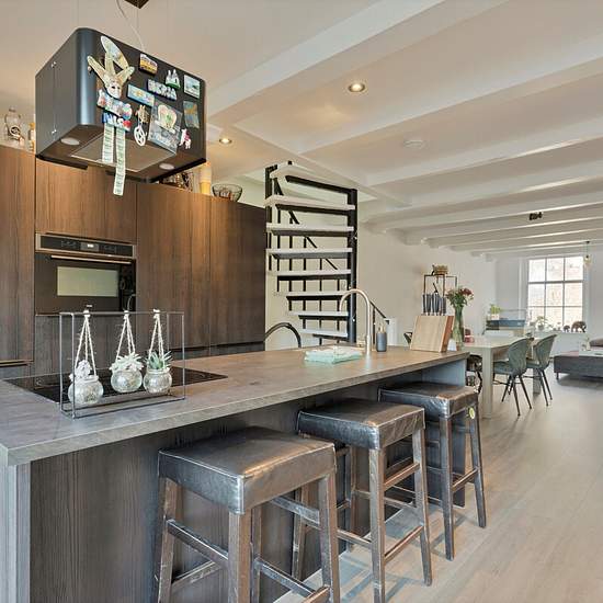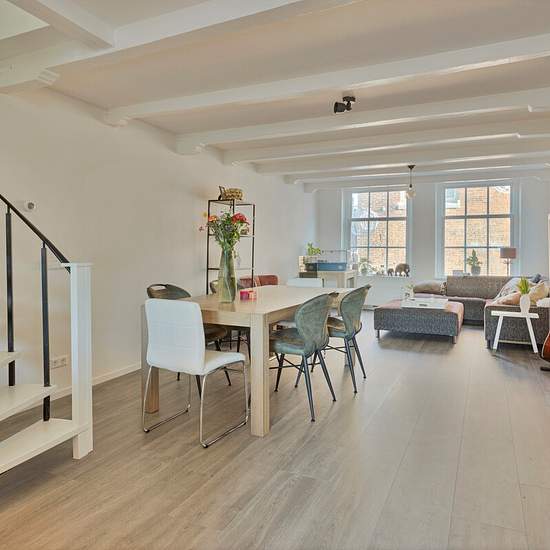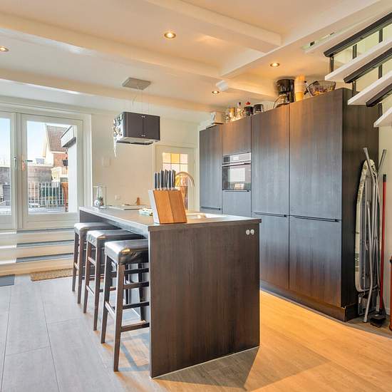 In the vibrant centre of Alkmaar, at the foot of the Grote Kerk, lies a fantastically renovated maisonette with a living area of 83 m2. Ground floor The communal entrance on the ground floor has mailboxes and a doorbell panel with intercom on the outside. The entrance provides access to a private storage room and the meter cupboard. If you continue on, you reach the roof terrace and the apartment via the external stairs. First floor On the first floor you can enter the apartment through the French doors. The spacious kitchen with island is e...