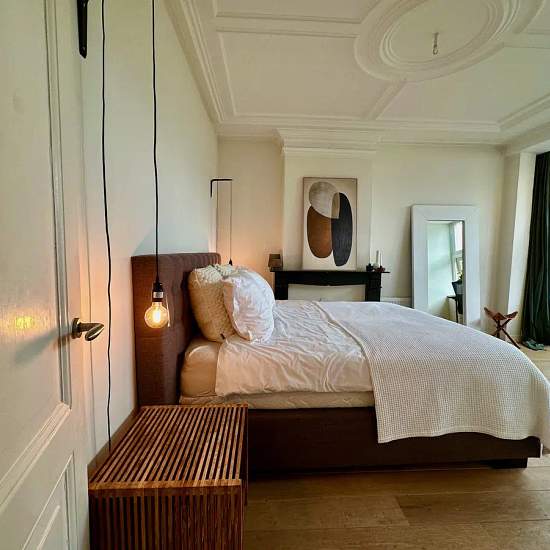 Description Beautiful fully furnished 2-bedroom apartment with a large roof terrace of 65 m2. The apartment is accessed via the communal stairway on the third floor. From the hallway all rooms are accessible. The living room is located at the front of the building; large windows give a light and bright feel. The open kitchen is equipped with built-in appliances. At the rear there is one large bedroom and one smaller bedroom. There is a separate toilet and the bathroom has a large walk-in shower with two rain showers, a double sink with vani...