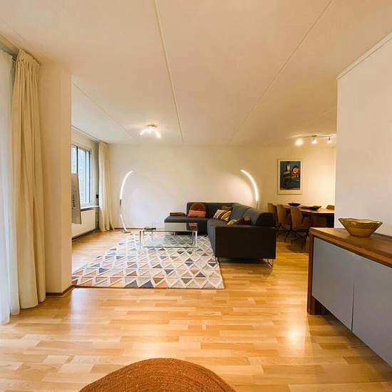 This tastefully furnished and modern 2-bedroom apartment with sunny balcony and private storage is located in Amsterdam South, within walking distance of Gelderlandplein and close to the World Trade Center. The property is part of a well-maintained building and accessible via an elevator.Layout:Entrance via the communal hallway with elevator to the apartment floor. Spacious and bright living room with open-plan layout and separate dining area. The apartment is stylishly furnished and features high-quality laminate flooring throughout. The se...