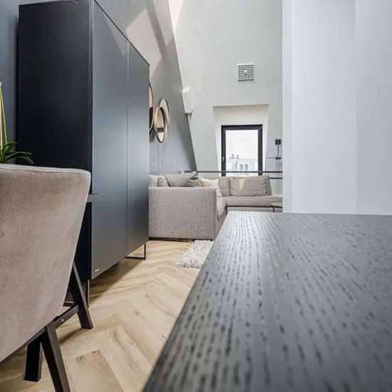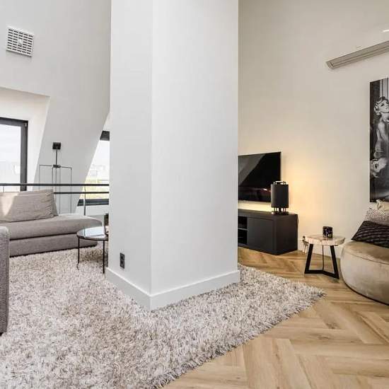 Description English translation below Modern penthouse located on the 4th and 5th floors of the apartment building “Loods M” situated at the Nieuwe Mark, in the centre of Breda. The apartment has one bedroom and its own parking space in the underground garage. The apartment is located in the centre of Breda. From the 5th floor the apartment enjoys a nice view over the Nieuwe Mark. Layout Ground floor: Central entrance with door panel with intercom system, mailboxes, staircase and lift to the apartments. Fourth floor: Entrance/hallway with...
