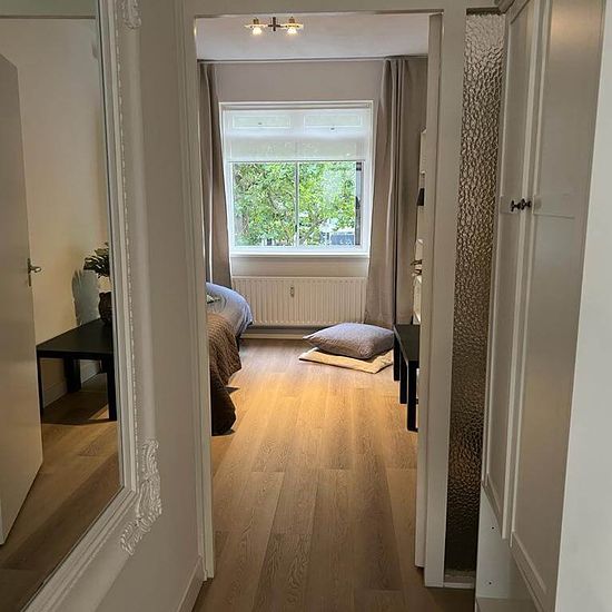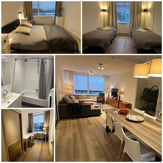 Nice four-bedroom apartment on the second floor in the city centre of Amstelveen. Layout: From the entrance you enter a hallway that provides access to a large living room, a dining area with a balcony, a kitchen with all necessary appliances, a separate toilet, four bedrooms, a storage room, and a bathroom with a bathtub, sink, washing machine and dryer. Location: The apartment is centrally located, just behind the city centre with a wide range of shops, restaurants, a theatre, cinema, library, etc. A bus stop is a 3-minute walk away, wit...