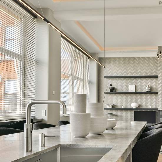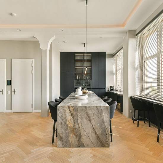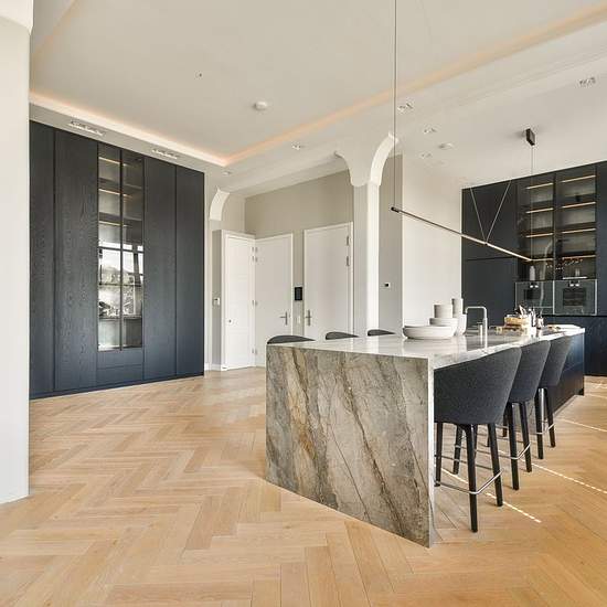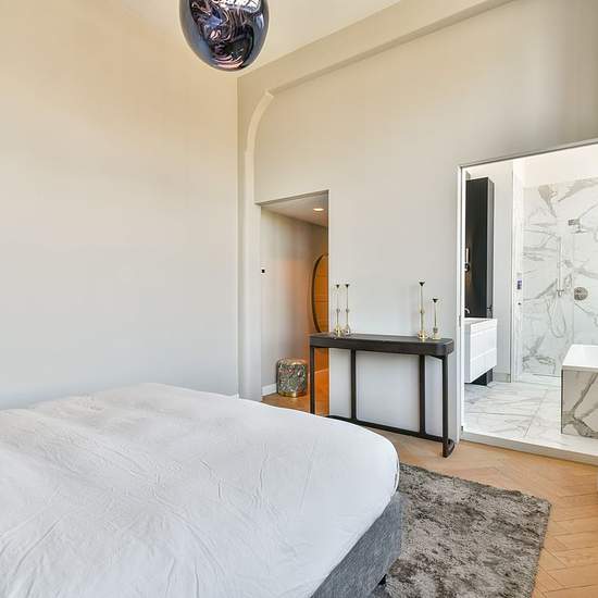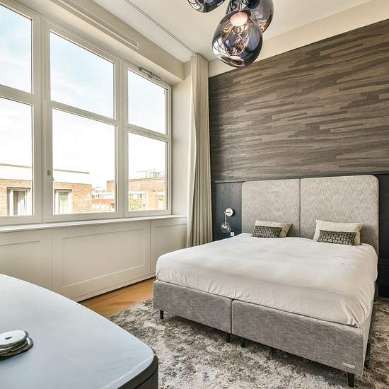 Architect-designed and furnished apartment with an elevator, three bedrooms, two bathrooms, and a parking space in the former Asscher diamond-cutting factory in De Pijp. The original building from 1907 was designed by Gerrit van Arkel and has now been transformed into a multifunctional building. The entire apartment is controlled by a home automation system. LAYOUT Via the secured entrance on the ground floor the apartment can be reached by elevator or stairs to the second floor. The elevator opens directly into the residence. From the hall...