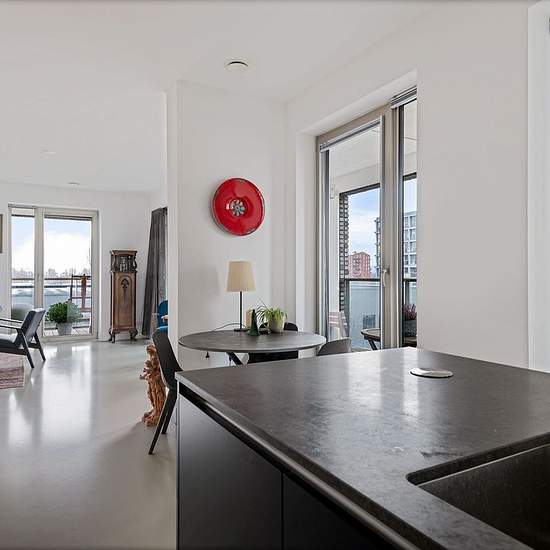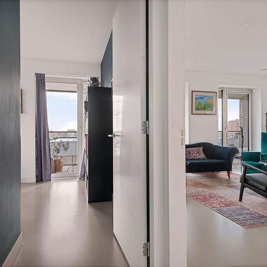 For rent for a longer period (minimum 3 years), a wonderfully spacious and bright corner apartment of approximately 105 m² with 3 bedrooms, high ceilings, a private parking space, (bicycle) storage and a generous terrace of no less than 42.9 m². Because of the tall windows with several balcony doors and a double sliding door — and because the spacious, covered terrace adjoins the living room and the eat-in kitchen — it truly serves as an addition to the living space. The apartment is on the third floor of a luxurious and sustainably built re...