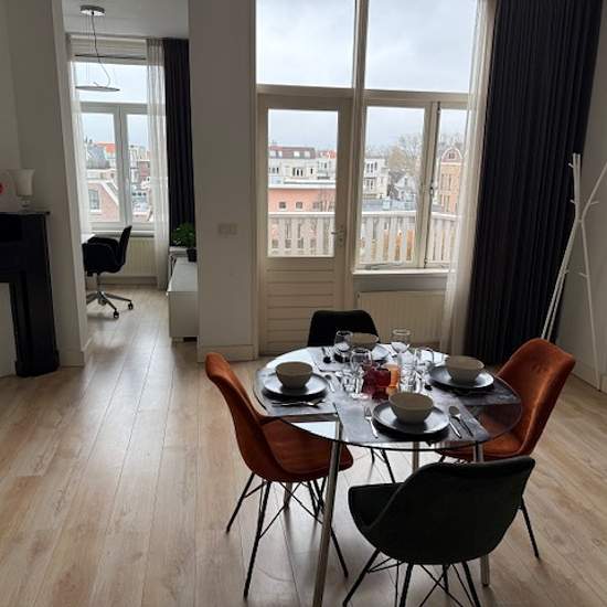 FOR RENT: Fully furnished 4-room/2-bedroom short-stay apartment centrally located between Avenue Concordia and the Hoflaan in Kralingen‑Rotterdam. The apartment is located on the 2nd and 3rd floors and also has a lovely roof terrace to enjoy the sun. Kralingen is known among young and old as a trendy international neighborhood full of atmosphere. It is very conveniently located for Erasmus University and about a 10-minute bike ride from Rotterdam city center. There are several pleasant shopping streets with delicatessens, supermarkets, bouti...