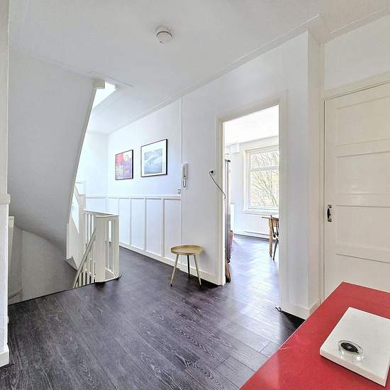 SUITABLE FOR A SINGLE OR A COUPLE/FAMILY WITHOUT PETS Bright and very generous apartment with sunny rooftop terrace in the Rivierenbuurt Lovely spacious and light duplex upper apartment of approximately 120 m², spread over the second and third floors. With a fantastic sunny rooftop terrace of approximately 22 m² and a balcony, you can fully enjoy outdoor living here. Located on a green, spacious street in the popular Rivierenbuurt. Layout Via the stairwell you reach the apartment on the first floor. An internal staircase leads to the seco...