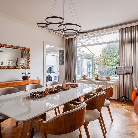 Located within walking distance of the charming village centre of Wassenaar, this spacious and well-maintained townhouse offers generous living space, five bedrooms, and both a front garden and a sunny backyard with shed and rear access. A wonderful family home combining character, comfort and an excellent location. Layout Ground floor: Entrance, hall with meter cupboard and cloakroom. Draft separation with beautiful stained-glass doors leading to the hallway with toilet and access to the dry basement housing the central heating boiler. The ...